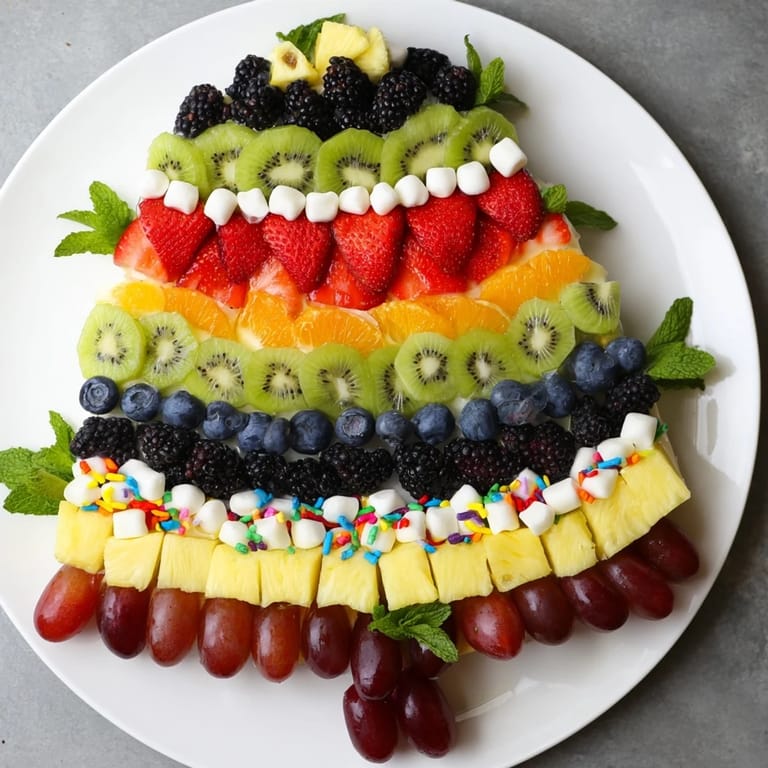 Save to Pinterest A vibrant and festive fruit board arranged in the shape of a birthday cake slice, perfect for celebrations and healthy snacking.