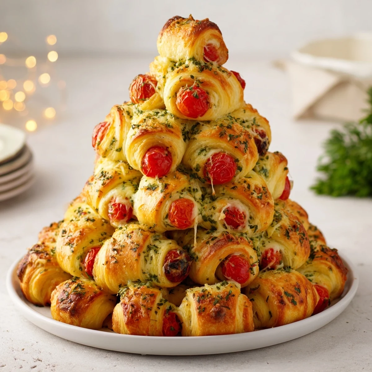 Grape tomatoes are placed as ornaments on the baked crescent trees, adding color and a festive touch.