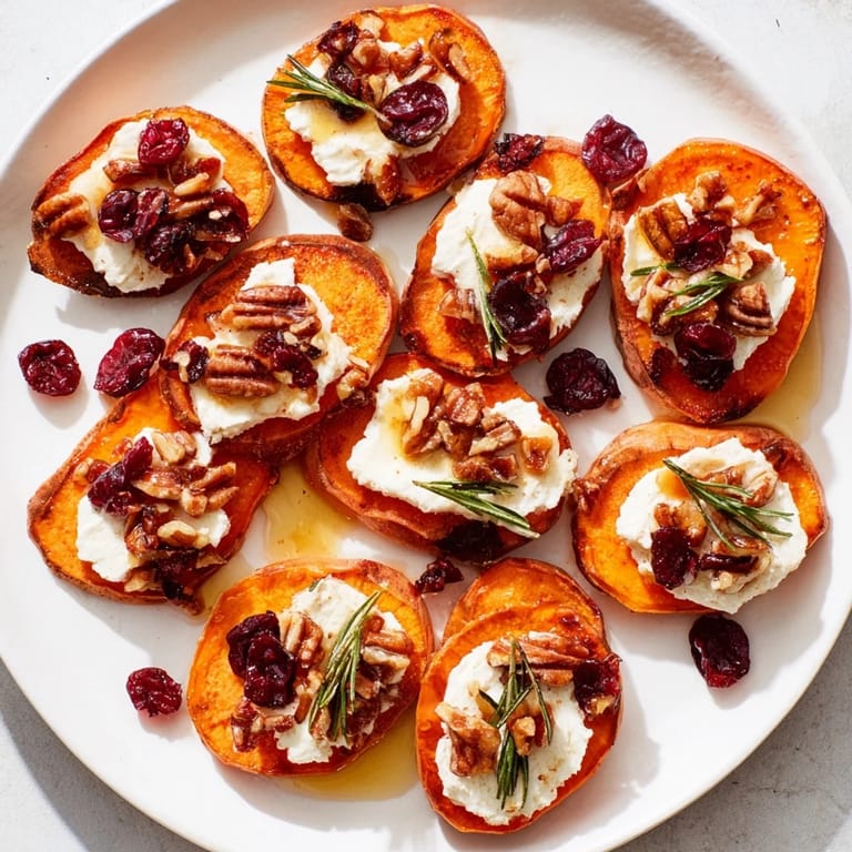 Save to Pinterest Tender roasted sweet potato slices topped with creamy cheese, cranberries, and pecans—a festive, flavorful appetizer perfect for holiday gatherings.