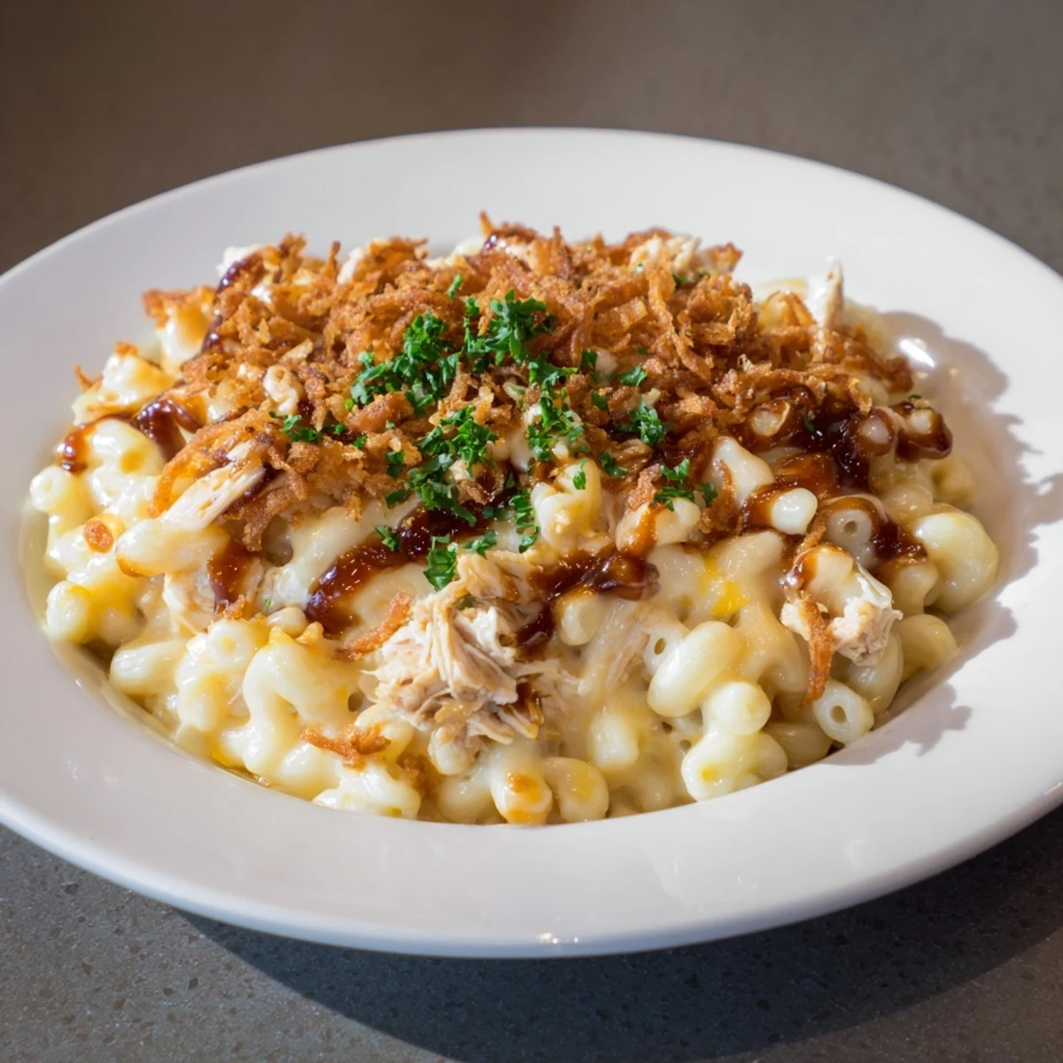 Crispy fried onions or bread crumbs create a crunchy contrast that complements the creamy pasta and tender chicken.