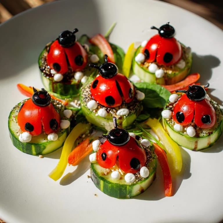 Save to Pinterest A whimsical and colorful appetizer platter featuring fresh vegetables and cheese creatively arranged to resemble ladybugs in a garden perfect for parties picnics or kids gatherings.