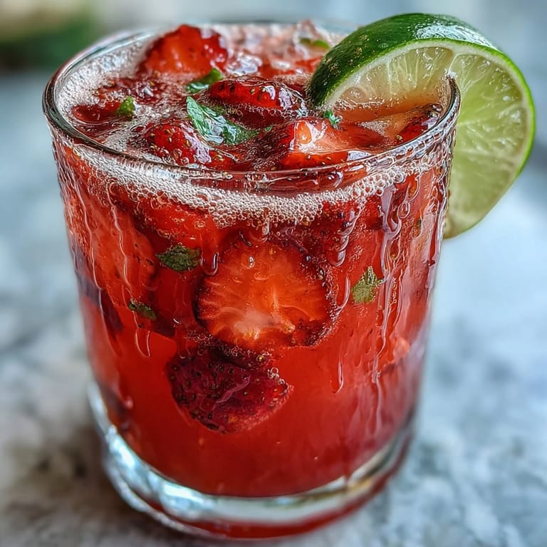 Lime slices, fresh mint leaves, and extra strawberry slices add color and aroma. A thin lime wheel on the rim brightens presentation.