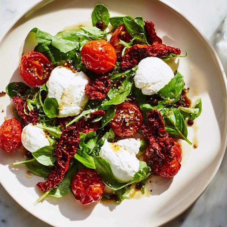 I made this for a friend who'd been talking about wanting to eat lighter, and watching her face when she took that first bite—the burrata spilling into the still-warm roasted tomatoes, the basil hitting all at once—I knew this wasn't just salad. It became our thing that summer, the dish that showed up whenever we wanted to feel a little fancy without the stress.