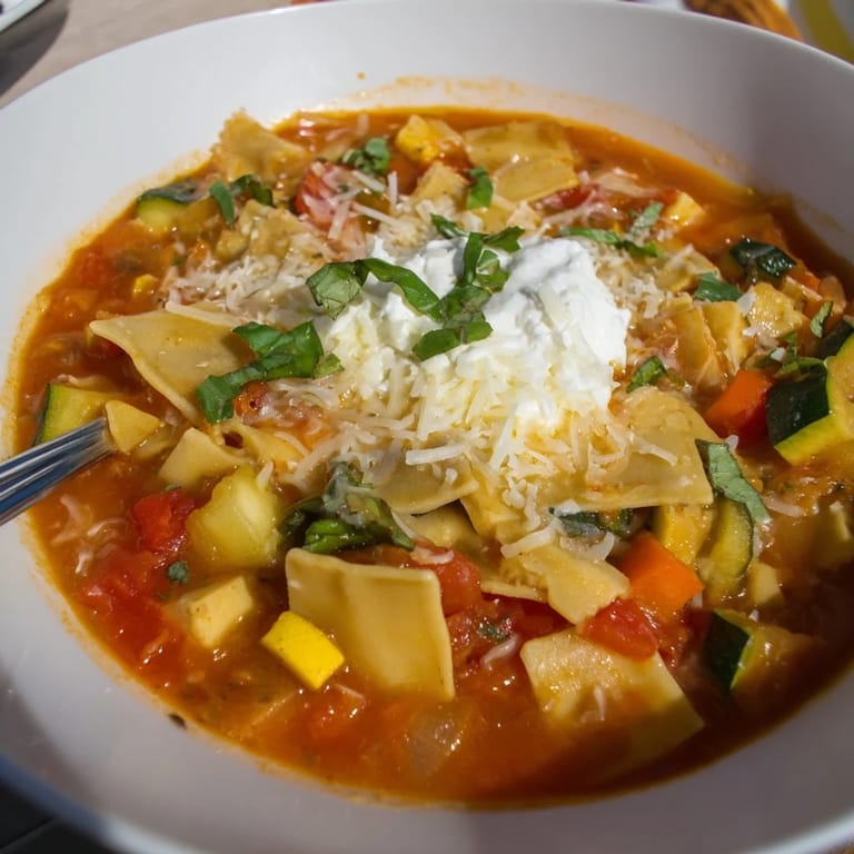 Save to Pinterest A hearty, comforting soup that brings all the flavors of classic lasagna into a single pot, loaded with colorful vegetables and finished with a creamy, cheesy topping.